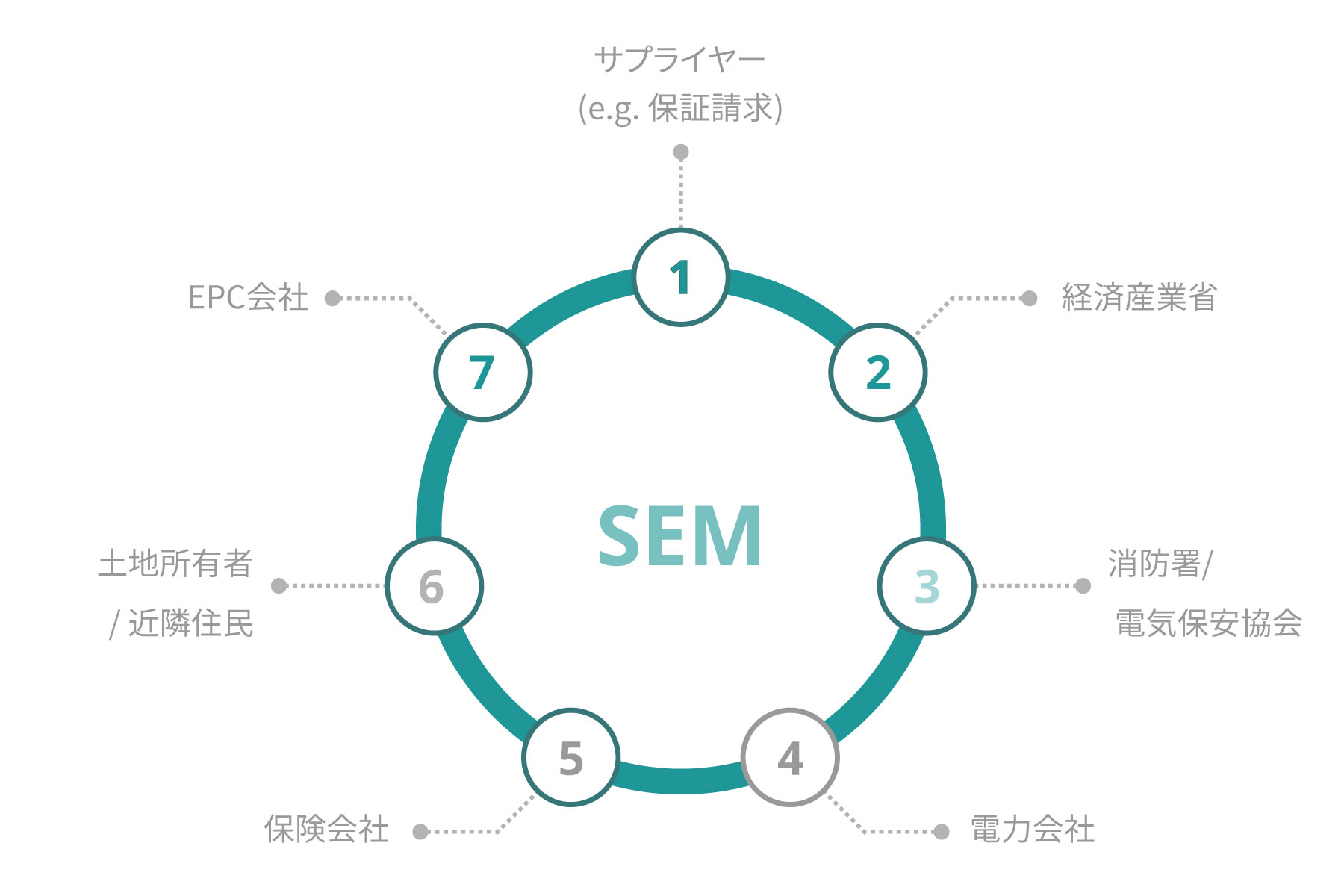 SEMは、サプライヤー・経済産業省・消防署・電気保安協会・電力会社・保険会社・土地所有者・近隣住民・EPC会社等の全ての関係者との調整事項を行い、事業主をサポートするワンストップサービスを提供します。